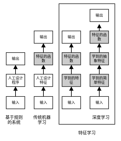 下图给出了不同AI系统中,不同部分的关联。阴影方框表示计算机从数据中学习获得的部分。