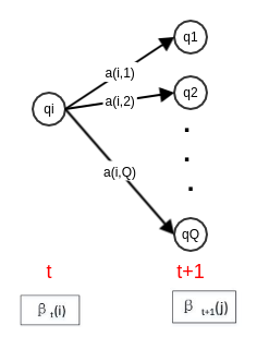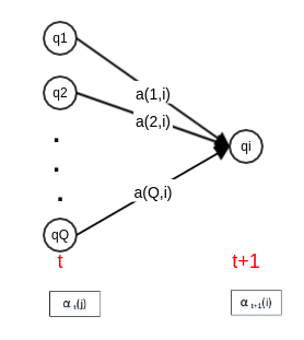 根据定义, 是在时刻 时观测到 ,且在时刻 处于状态 的前向概率。则有: