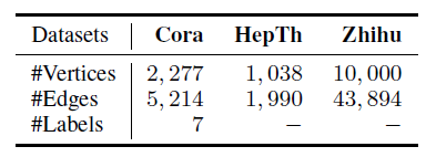 Zhihu:一个大型的在线问答网络,用户可以相互关注并在网站上回答问题。我们随机抽取了10000 名活跃用户,并使用他们关注主题的描述作为文本信息。
