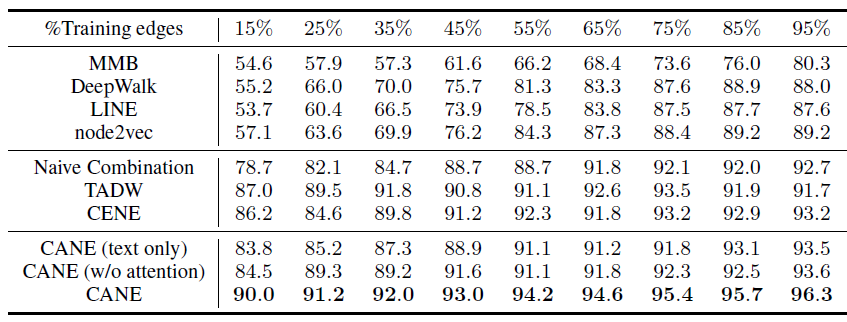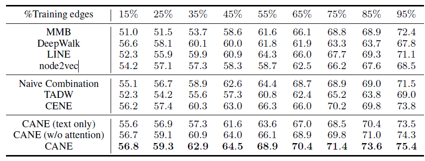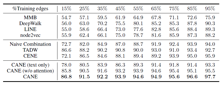 CANE 在所有训练集、所有训练比例都取得最好的效果,这表明 CANE 在链接预测任务中的有效性,验证了 CANE 具备精确建模顶点之间关系的能力。