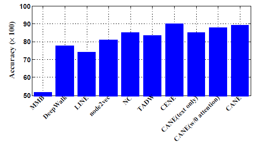 通过引入 mutual attention 机制,CANE 的性能比没有注意力的版本得到较大的提升。这与链接预测的结果是一致的。