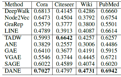 与普通网络embedding 方法相比,DANE 取得显著提升。