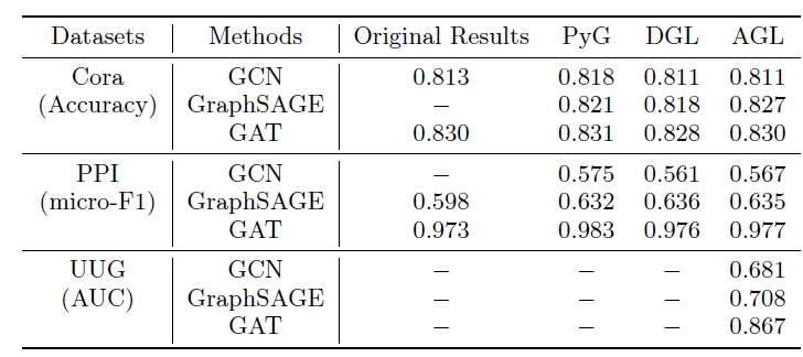 为公平起见,所有算法都是通过在系统上应用优化的算子来实现的。如果模型无法处理属性以及多种类型的节点,则在 embedding 中我们忽略这些信息。对于同质的、基于 GNN 的模型,我们为具有相同边类型的每个子图生成 embedding,然后将它们拼接在一起成为最终结果。