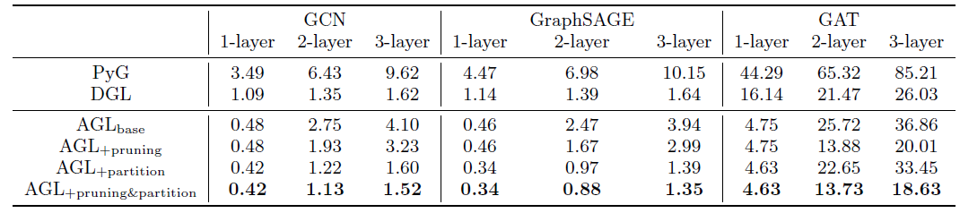Operators 的效果:我们进一步检查了我们的 AGGREGATE 和 COMBINE 算子的影响。下表给出了这两个算子的时间成本,以及我们提出的实现方案可以加速一个量级。