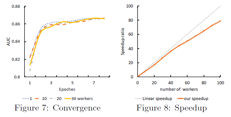 GATNE 模型在 150 个 worker 下,不到2 个小时就可以收敛。这验证了 GATNE 方法的高效性和可扩展性。