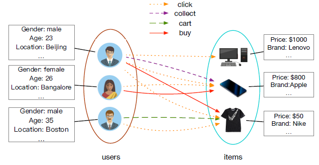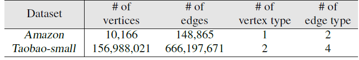 co-view或者共同购买 co-buy 行为。Taobao-small 具有两种类型的节点,即用户和商品,以及用户和商品之间的四种类型的边:点击click、添加收藏add-to-preference 、添加购物车add-to-cart 、购买buy。