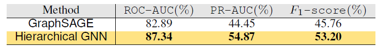 Hierarchical GNN:我们将 Hierarchical GNN 方法和 GraphSAGE 在 Taobao-small 数据集上进行比较。结果见下表所示。可以看到 F1-score 提升大约 7.5%。这表明 Hierarchical GNN 可以产生效果更好的 embedding 。