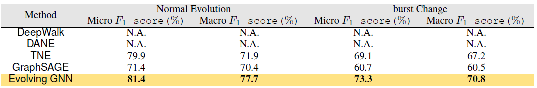 Evolving GNN:我们将 Evolving GNN 方法和其它方法在 multi-class 链接预测任务上进行比较。对比的方法包括:DeepWalk,DANE,DNE,TNE,GraphSAGE 等。这些竞争对手无法处理动态图,因此我们在动态图的每个快照上运行算法,并报告所有时间戳的平均性能。