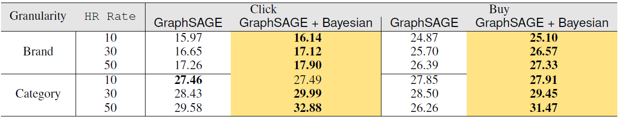 Bayesian GNN:该模型的目标是将贝叶斯方法和传统 GNN 模型相结合。我们对比了 GraphSAGE 模型。下表给出了在 Taobao-small 数据集上推荐结果的 hit recall rate。注意,我们同时考虑了商品品牌粒度以及类目粒度。显然,使用Bayesian GNN 时,hit recall rate 分别提高了 1% 到 3% 。