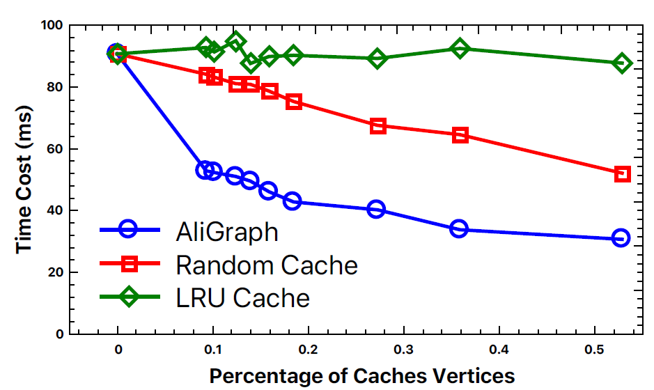我们还比较了基于 importance 的缓存策略以及另外两种策略:随机策略(它随机选择一部分比例节点,然后缓存这些节点的邻域)、LRU 策略。下图说明了时间成本和缓存节点比例之间的关系。