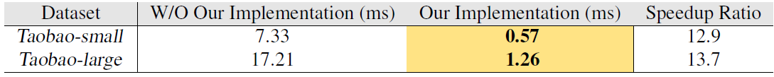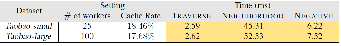 60 毫秒内完成。Taobao-large 是 Taobao-small 的六倍,但是这两个数据集的采样时间却非常接近。这些观察结果证明了我们对采样方法的实现是有效且可扩展的。
