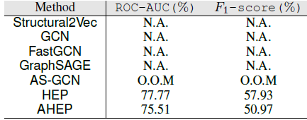 在下表中,我们给出了在 Taobao-small 数据集上 AHEP 和它的竞争对手的比较结果。N.A. 表示算法无法合理的时间内结束;O.O.M. 表示算法由于内存溢出而终止。