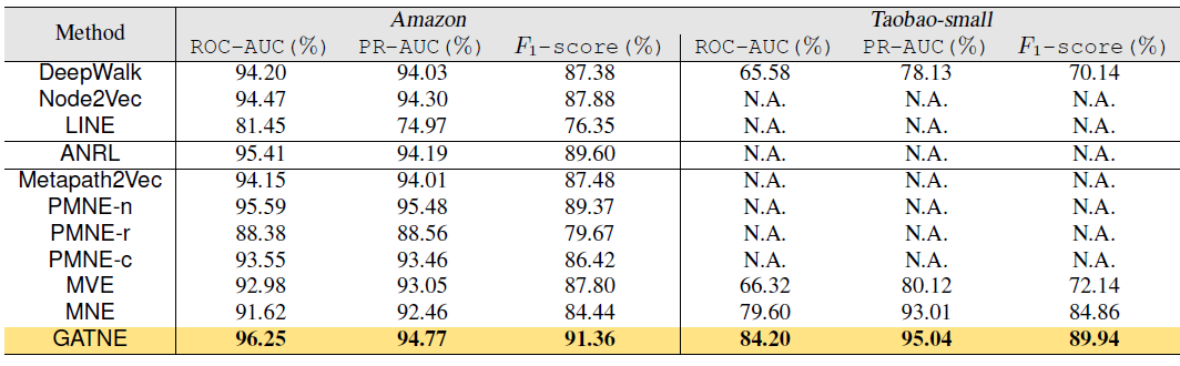 GATNE 算法:GATNE 的目标旨在处理节点和边上都有异质信息和属性信息的图。我们在下表给出了 GATNE 和它的竞争对手的结果。显然,我们发现 GATNE 在所有指标上都优于所有现有方法。