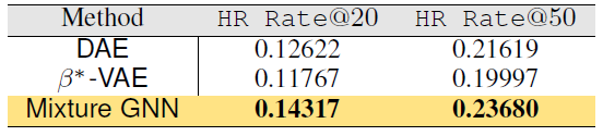 Mixture GNN:我们将 Mixture GNN 方法和 DAE、Taobao-small 数据集上进行对比。下表给出了将 embedding 结果应用于推荐任务的点击召回率 hit recall rate。可以看到 Mixture GNN 的 hit recall rate 提升大约2% 。