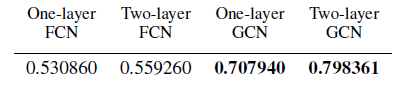 为分析图卷积矩阵的影响,我们在 Cora 引文网络上对比了 GCN 和 FCN 在半监督分类上的性能,其中每个类别有 20 个标记数据。对比结果如下表所示,可以看到:即使只有一层,GCN 也要比 FCN 效果好得多。
