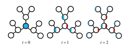 第一步,某些能量(红色)“存储” 在当前节点,剩余能量(蓝色)传播到邻居中。