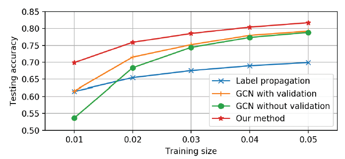但是卷积层数量太少也会有问题。在半监督学习中标记数据太少,这使得浅层 GCN 无法将标签信息有效地传播到整个图。这就是卷积滤波器局部性带来的困扰。如下图所示(Cora 数据集),随着训练的标签数据的减少,GCN 性能迅速下降。即使采用了额外的 500 个标记样本作为验证集(图中的 GCN with validation 曲线),GCN 的性能也是迅速下降。