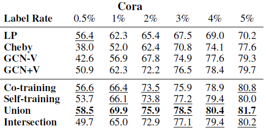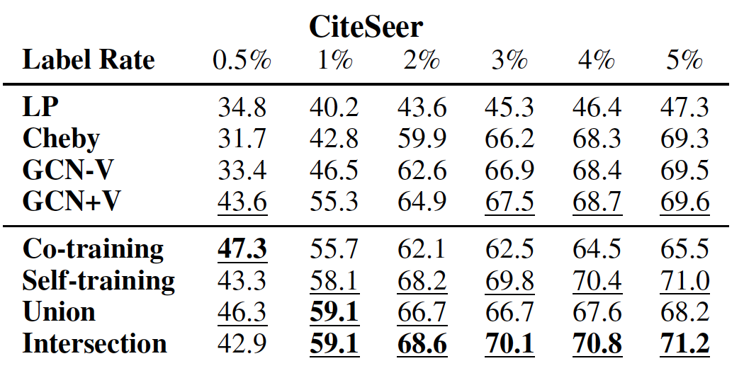Co-Training 、Self-Training 分别挖掘出各自最置信的未标记节点。GCN,这称为 Union。其中使用预先训练好的 GCN 来作为二次训练的初始化。GCN,这称为 Intersection。其中使用预先训练好的 GCN 来作为二次训练的初始化。注意:我们在扩展的标记数据上训练 GCN,无需任何额外其它验证数据。只要扩展的标记数据包含足够多的正确的标记数据,则我们的方法就有希望训练出良好的 GCN 分类器。