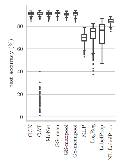 《Semisupervised classification with graph convolutional networks》 使用了额外 500 个标记数据作为验证集,这远多于训练标记数据。这是不可取的,因为这违反了半监督学习的目的。此外,这也使得 GCN 和其它方法的比较不公平,因为其它方法(如标签传播)可能根本不需要验证集。