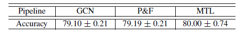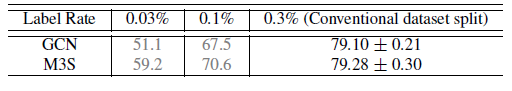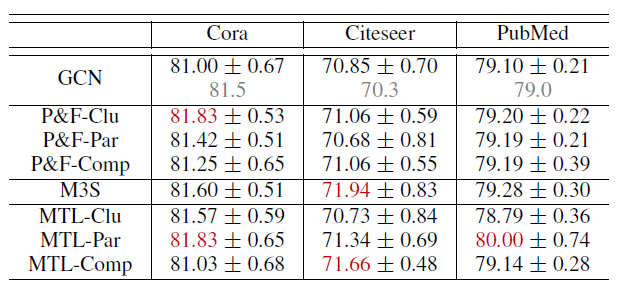 让 GCN “看到” 更多标记数据的另一个方法是对 GCN 进行 self-train 。具体而言,我们首先通过给定的标记数据来训练 GCN,然后通过比较 softmax 得分为每个类别选择最置信的未标记数据,然后将这些未标记数据添加到对应的类别的标记数据集合中。然后,我们使用扩展的标记数据集合来训练 GCN,并使用预先训练好的 GCN 来作为初始化。