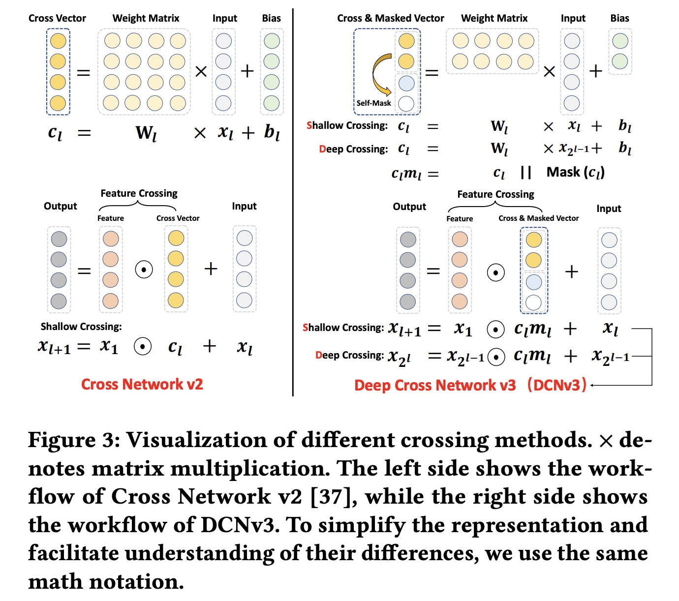 network input 的过度共享(excessive sharing)。DCN 中的交叉网络(cross network)和深度网络(deep network)共享相同的embedding layer 作为输入,这意味着所有input features 都被无差别地输入到并行网络中。然而,正如《AutoFeature: Searching for Feature Interactions and Their Architectures for Click-through Rate Prediction》 所指出的,不同的特征适用于不同的interaction 函数。因此,network inputs 的过度共享,以及将所有特征无差别地输入到所有并行网络中,可能不是一个合理的选择,会导致性能不佳。