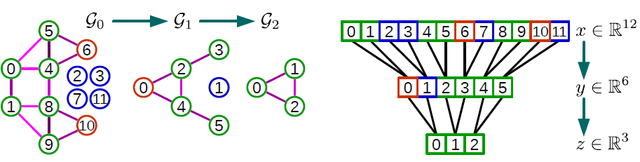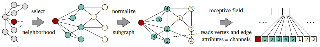 图 positional 的、或者是 nonpositional 的。nonpositional graph 是前面所讲的那些图。positional graph 与之不同,节点 unique 的整数标识符,从而指示每个邻居的逻辑位置logical position 。 形式上,对于positional graph 中的每个节点,存在一个映射函数 position region adjacency graph(如上图所示) :可以用