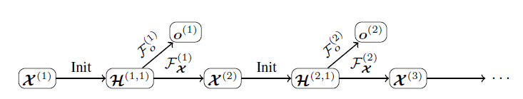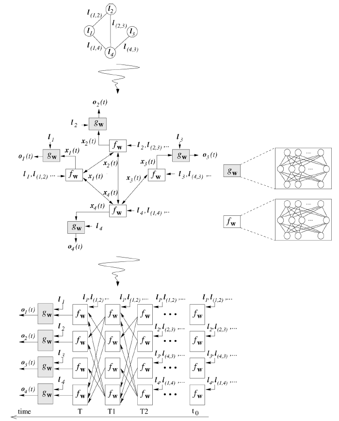 梯度 GNN 中发生的扩散过程diffusion process以非常高效的方式进行。这种扩散过程与 RNN 中发生的扩散过程非常相似,而后者是基于backpropagation-through-time: BPTT 算法计算梯度的。在这种情况下,编码网络从时刻 unfold 到初始时刻 unit