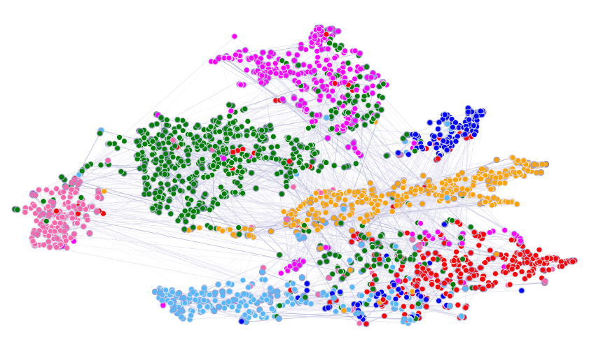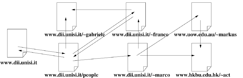 另一个例子来自于网页分类。web 可以通过一个图来表达,其中节点代表网页,边代表网页之间的超链接,如下图所示。可以利用 web connectivity 以及网页内容来实现多种目的purposes,,如页面的主题分类。