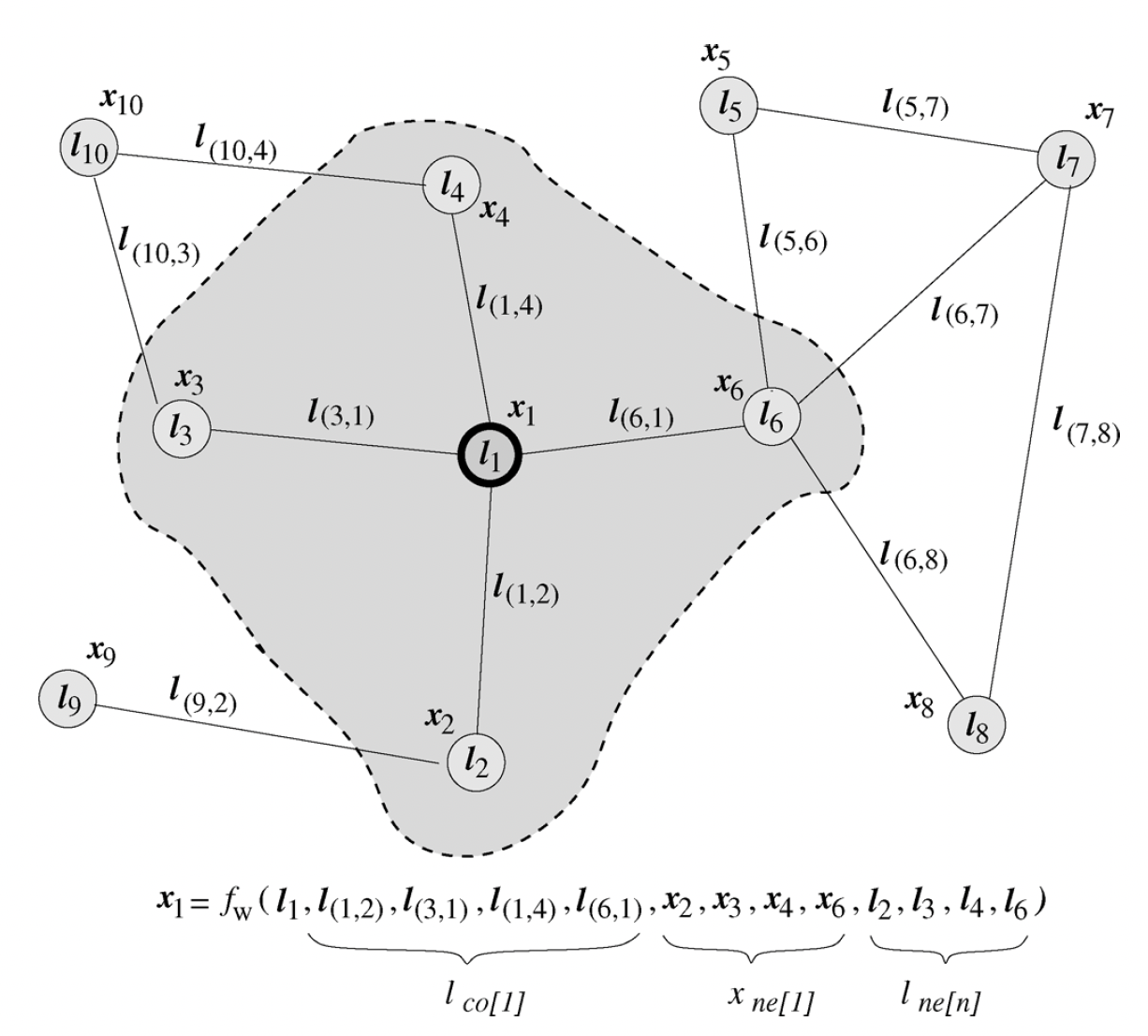 令 parametric的函数,称之为局部转移函数 local transition function ,用于表示节点对其邻域的依赖性。令 local output function,用于描述如何产生输出。那么