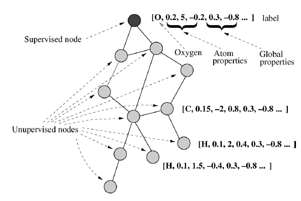 节点和边可能含有额外的信息,这些信息统称为标签信息(它和监督学习中的标记label 不是一个概念),并以实值向量的形式来表示。