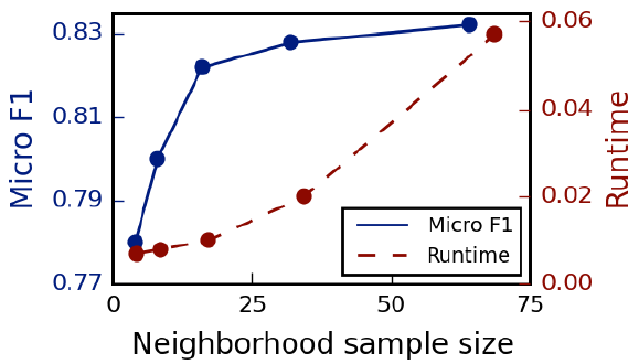 在使用重要性池化时,邻域大小 PinSage 的训练时间和训练效果。我们发现随着