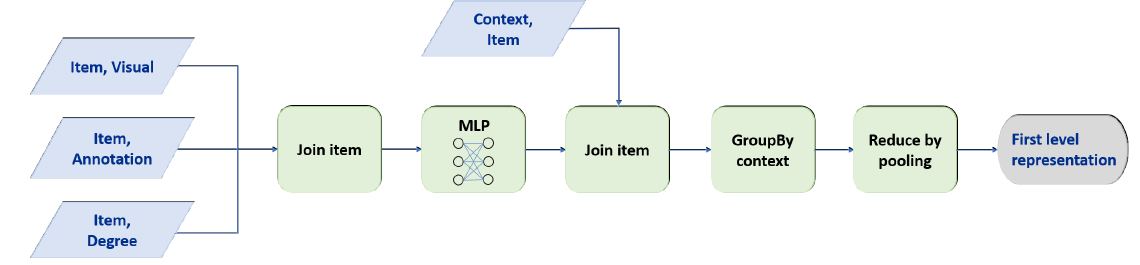 MapReduce 作业将所有 pin 投影到低维embedding 空间。MapReduce 作业通过将 board 内的 pin 的 embedding 进行池化,得到 board 的 embedding 。我们的方法避免了冗余计算,并且每个节点的潜在 embedding 仅计算一次。