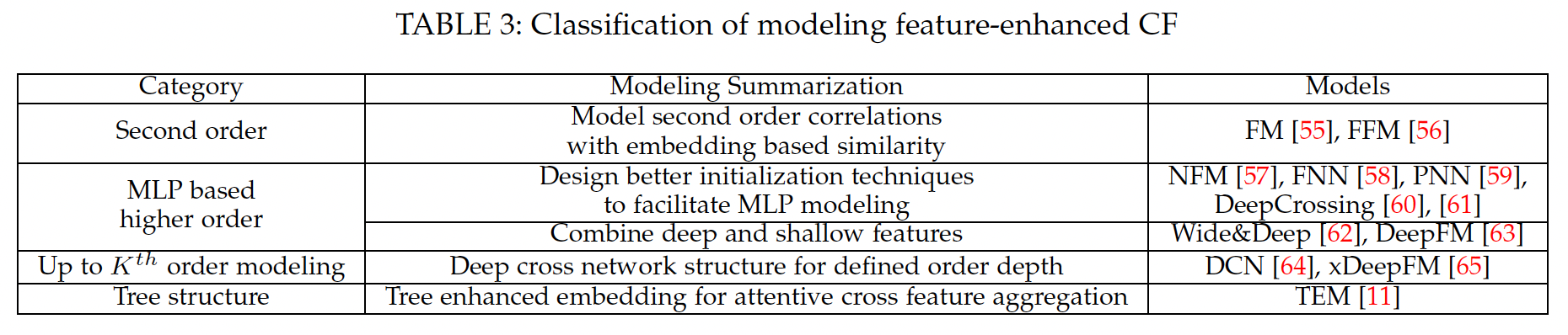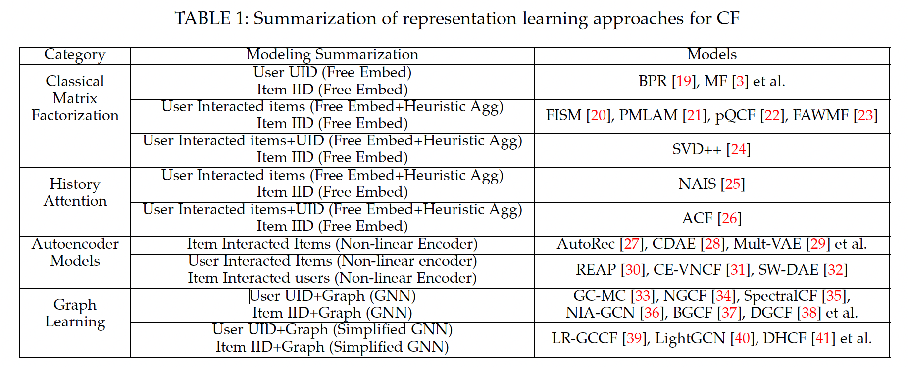 事实上,由于每个用户的行为数量是有限的(相比于 CF 中的一个关键挑战是 user-item 交互行为的稀疏性。不同类型的 representation learning 模型在输入数据、以及 representation modeling 等方面有所不同。我们将这些模型分为三类:历史行为聚合增强的模型history behavior aggregation enhanced models、基于自编码器的模型、图学习方法。为了便于说明,我们在下表中列出典型的、用于 CF 的 representation learning 模型。