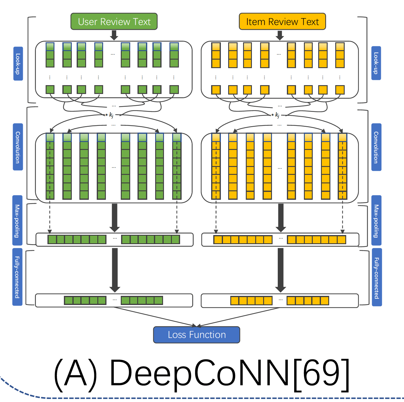 深度模型 DeepCoNN 是基于评论的推荐。如下图所示,DeepCoNN 由两个用于内容建模的并行 TextCNN 组成:
