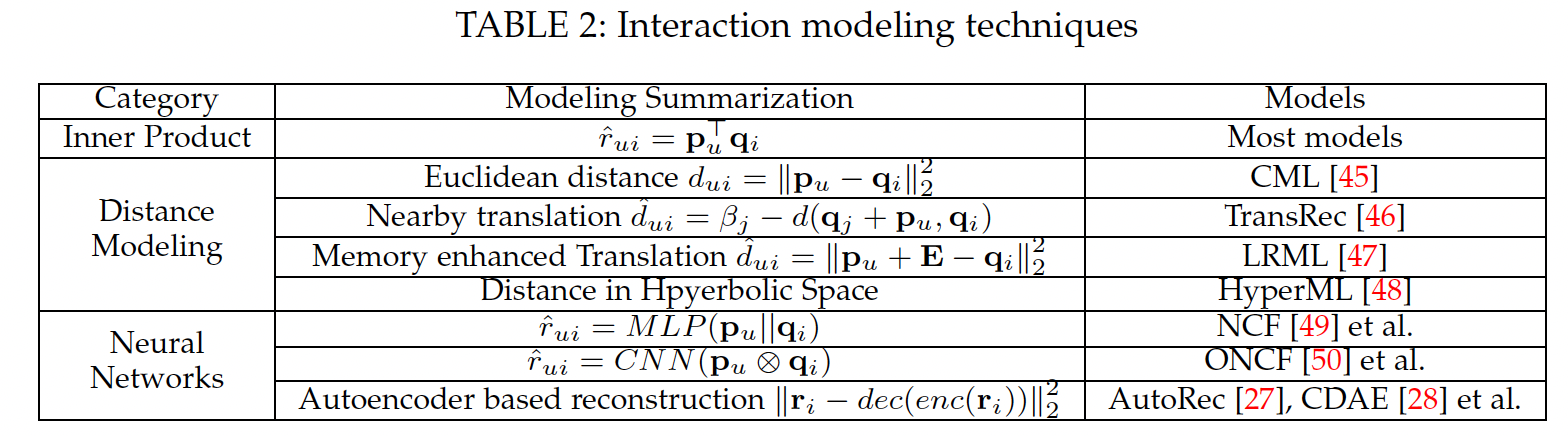 CF。这些模型可以被视为使用复杂的深度学习技术来学习用户编码器或 item 编码器。user 和 item 的对偶性,设计了两个并行编码器来学习 user representation 和 item representation,然后还使用内积来建模用户对 item 的偏好。值得注意的是:基于自编码器的 CF 方法也可以归类为 historical behavior attention based 模型的扩展,因为这些方法采用深度神经网络来聚合历史行为。因此,为了简单起见,我们只简单介绍了基于自编码器的模型,并没有重复具体的技术细节。