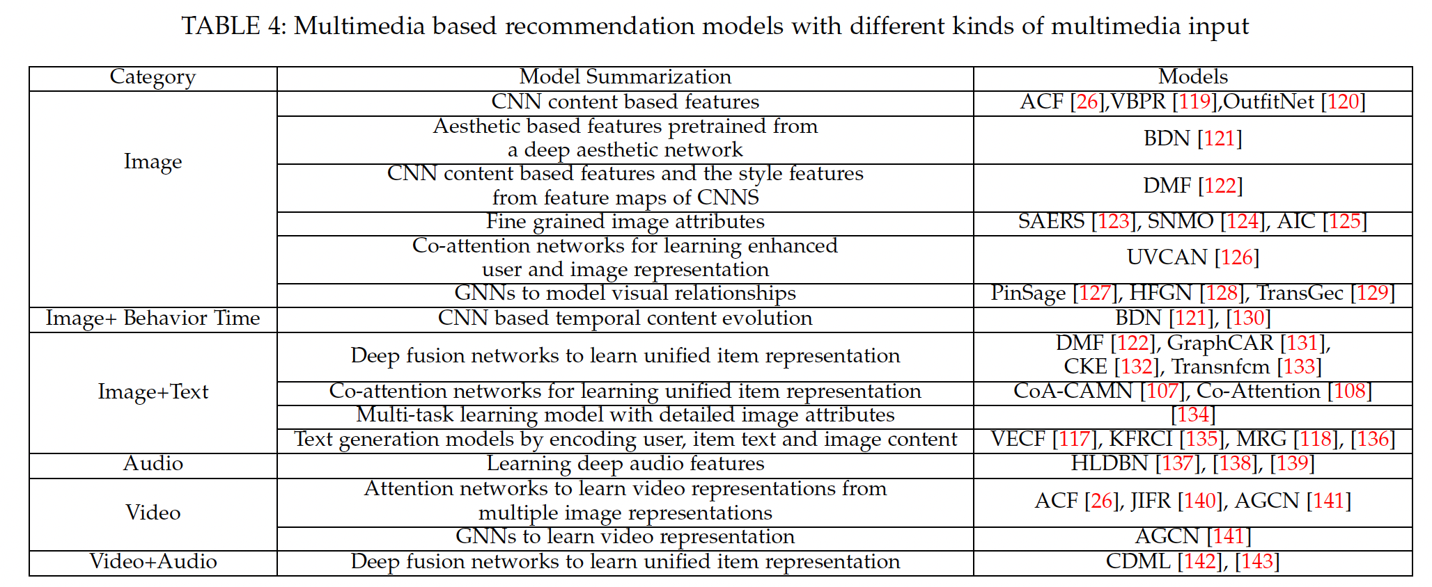 这里我们介绍在推荐系统中建模多媒体内容的相关工作。为了便于解释,我们在下表中总结了不同类型输入数据的、基于多媒体推荐的相关工作。