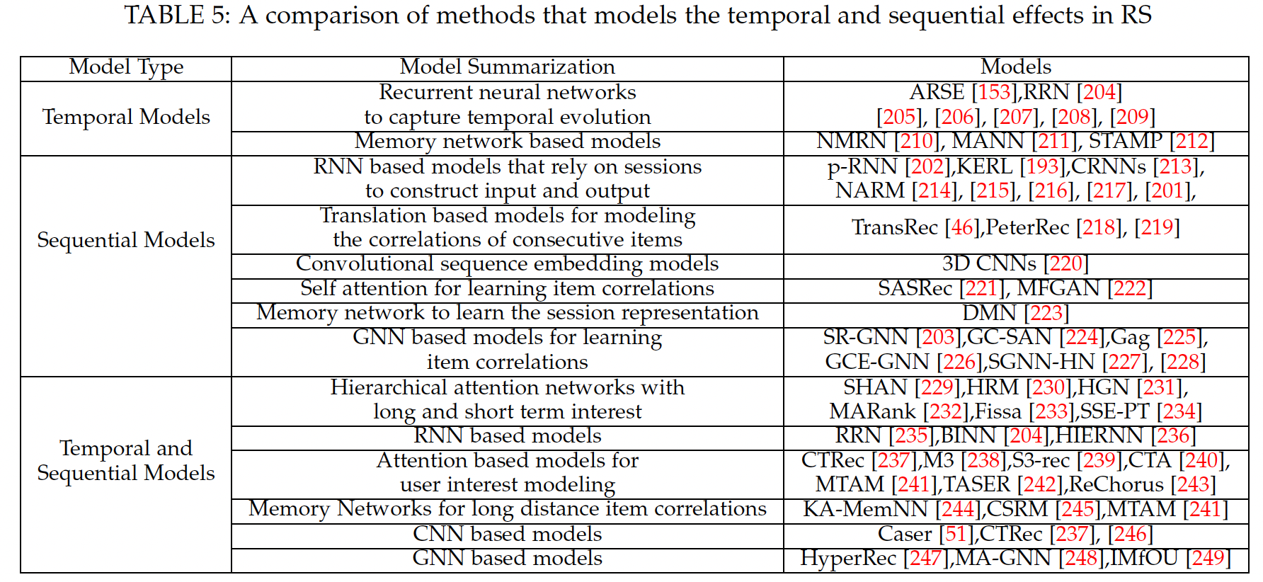 temporal based recommendation:对于一个用户 item user-item 交互行为被表示为一个四元组:session based recommendation:在某个会话 item 进行交互(例如,用购物车消费、在有限的时间段内浏览互联网)。在许多基于会话的 application 中,用户不登录且用户 ID 不可用。因此,基于会话的推荐的流行方向是从会话数据中挖掘序列的 item-item 交互模式从而获得更好的推荐。temporal and session based recommendation:这种方法结合了时间推荐和会话推荐的定义,其中每个事务 transaction 被描述为 item 的集合。在这种情况下,需要同时捕获 item 的时间演变temporal evolution和序列模式。我们在下表中总结了推荐系统中建模时间和序列效应的主要技术,并在下图中说明了一些代表性工作。