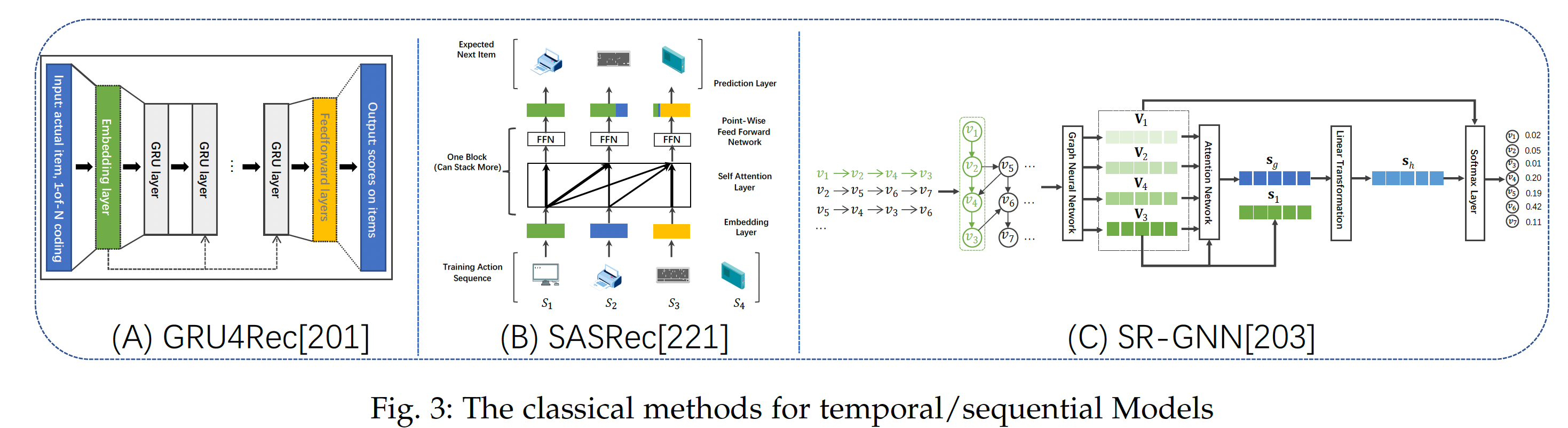 用户的偏好不是静态的,而是随着时间的推移而动态演变。与使用上述模型对用户的静态偏好static preference 进行建模不同,基于时序 temporal/sequential 的推荐聚焦于对用户的动态偏好dynamic preference 或随着时间的序列模式sequential pattern进行建模。