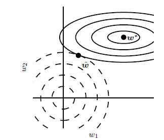如下所示:实线椭圆表示 的等值线,虚线圆表示正则化项 的等值线。