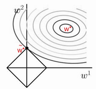 如下所示:实线椭圆表示 的等值线,实线菱形表示正则化项 的等值线。