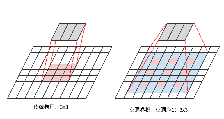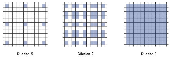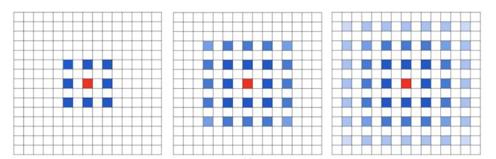 下面是一组dilation rate 分别为[1,2,5] 的卷积核,卷积核的尺寸为3x3