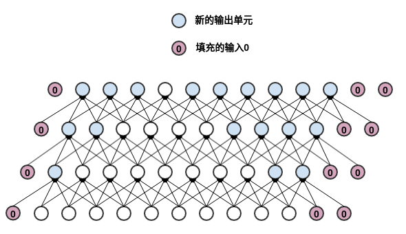 full 填充:在输入的两端各填充 个零,使得每个输入单元都恰好被卷积核访问 次。其中 为卷积核的宽度。