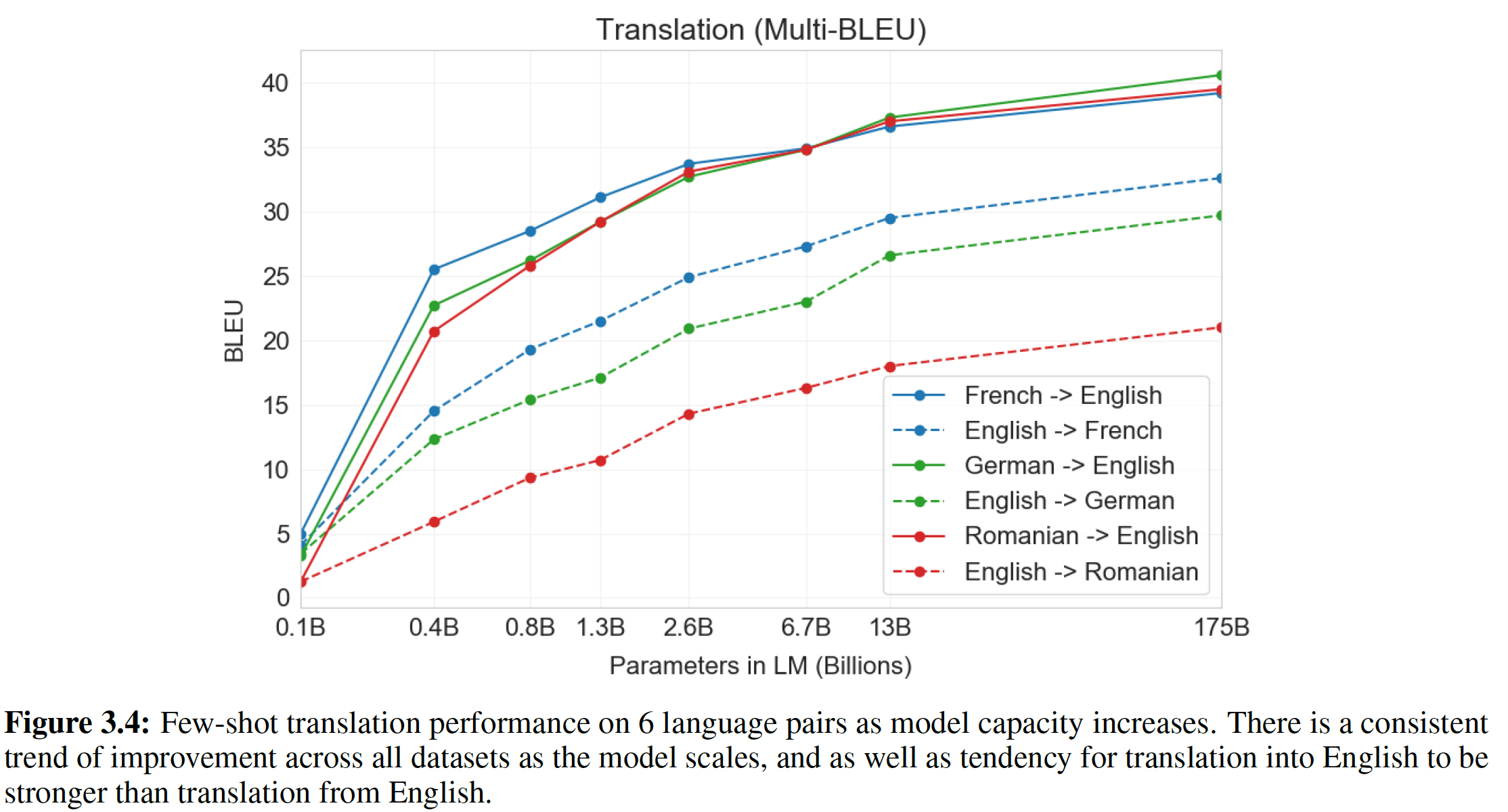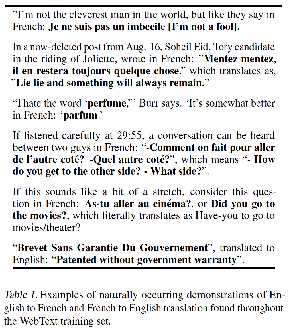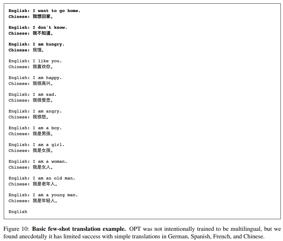 few-shot 翻译:模型并未刻意地进行多语言的训练,但是我们发现它在德语、西班牙语、法语、中文的简单翻译上取得了有限的成功。