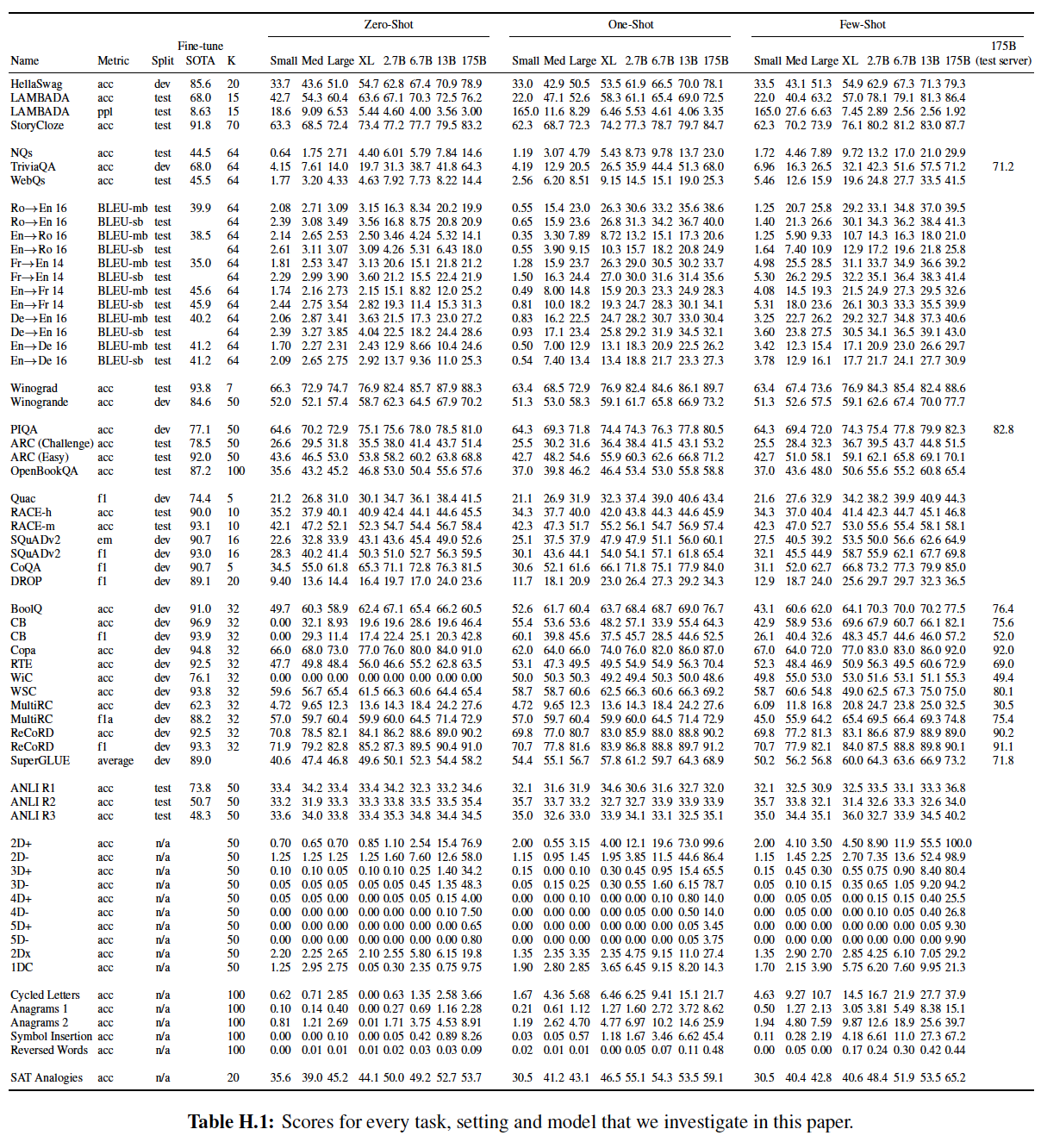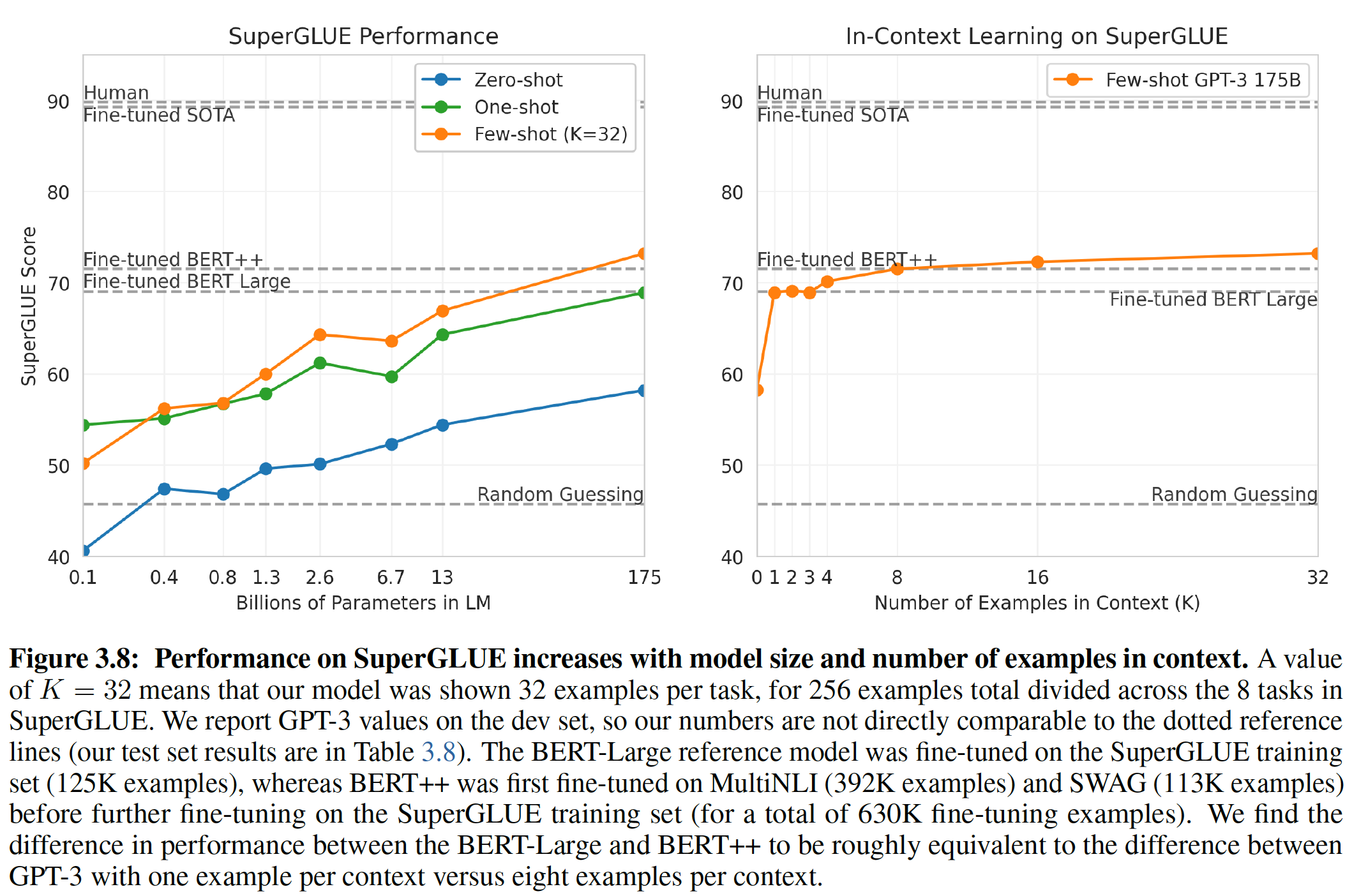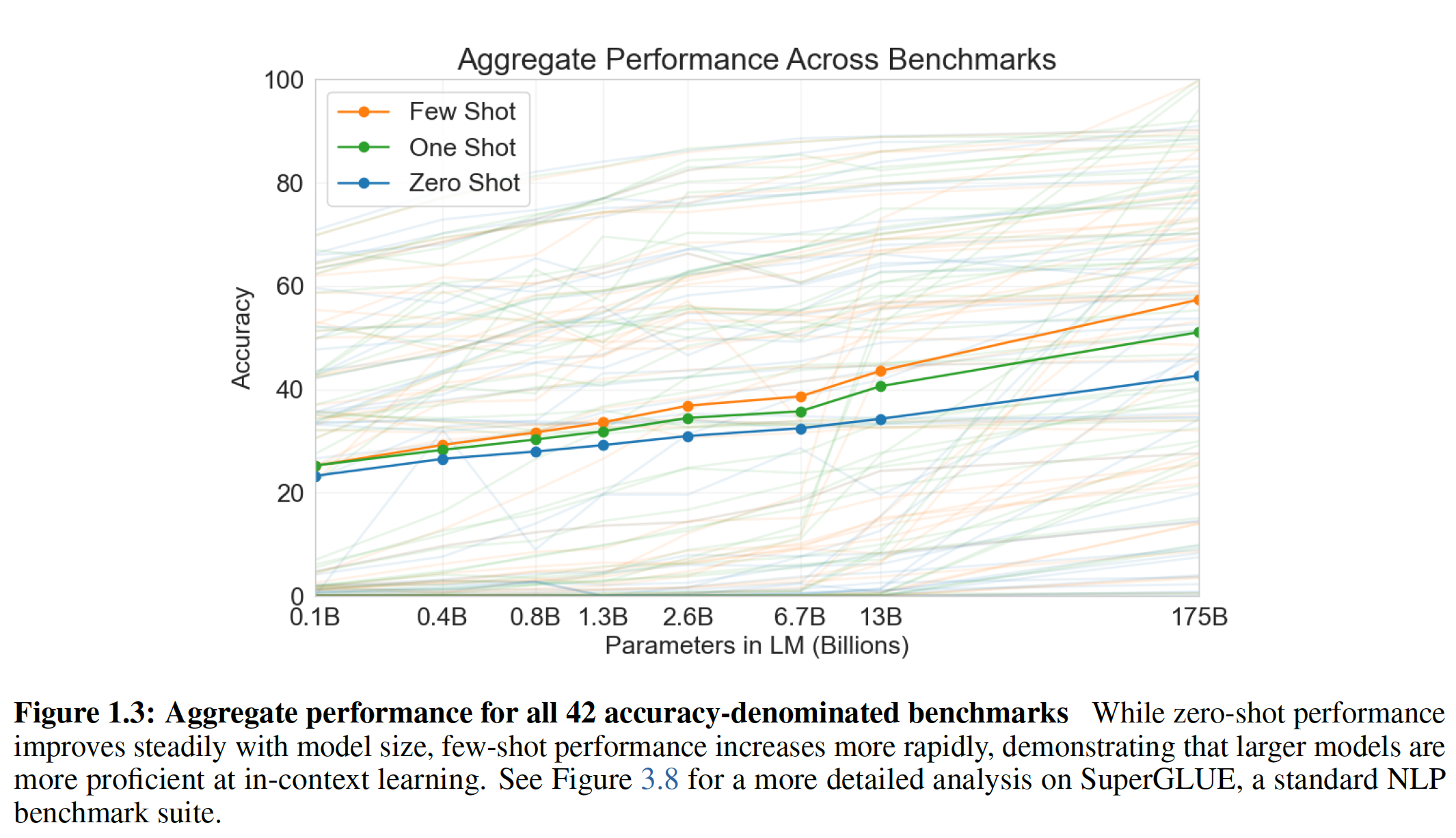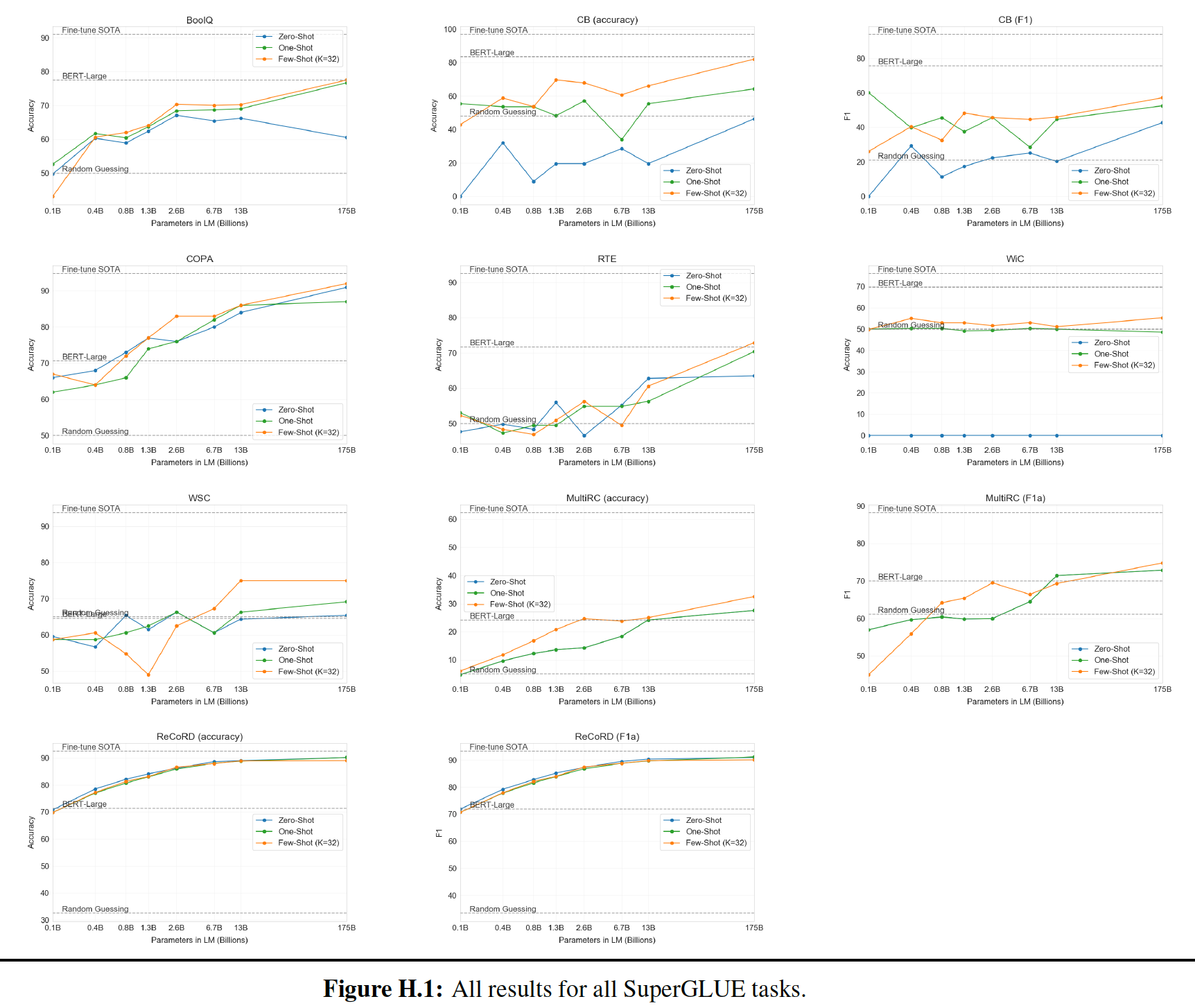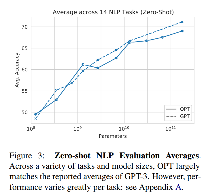 Zero-shot:所有 14 个任务的总体平均 zero-shot 性能如下图所示(忽略了 MultiRC 和 WIC )。总体而言,我们看到我们的平均性能遵循 GPT-3 的趋势。