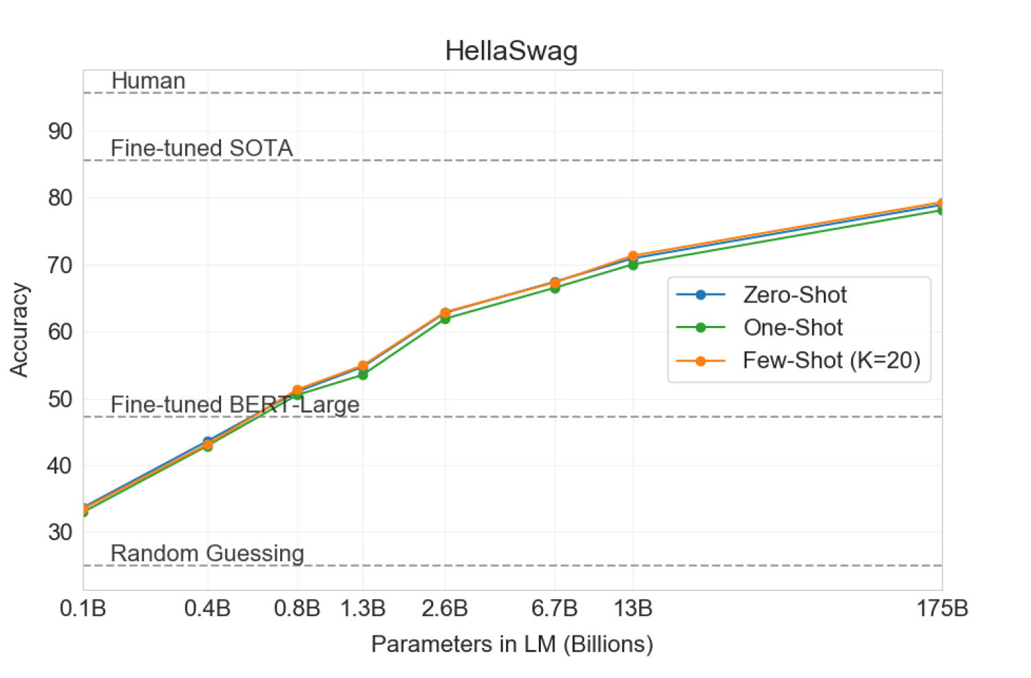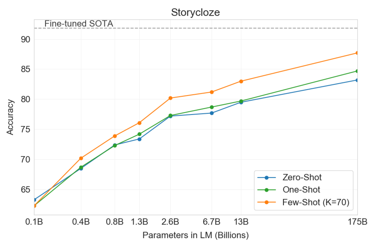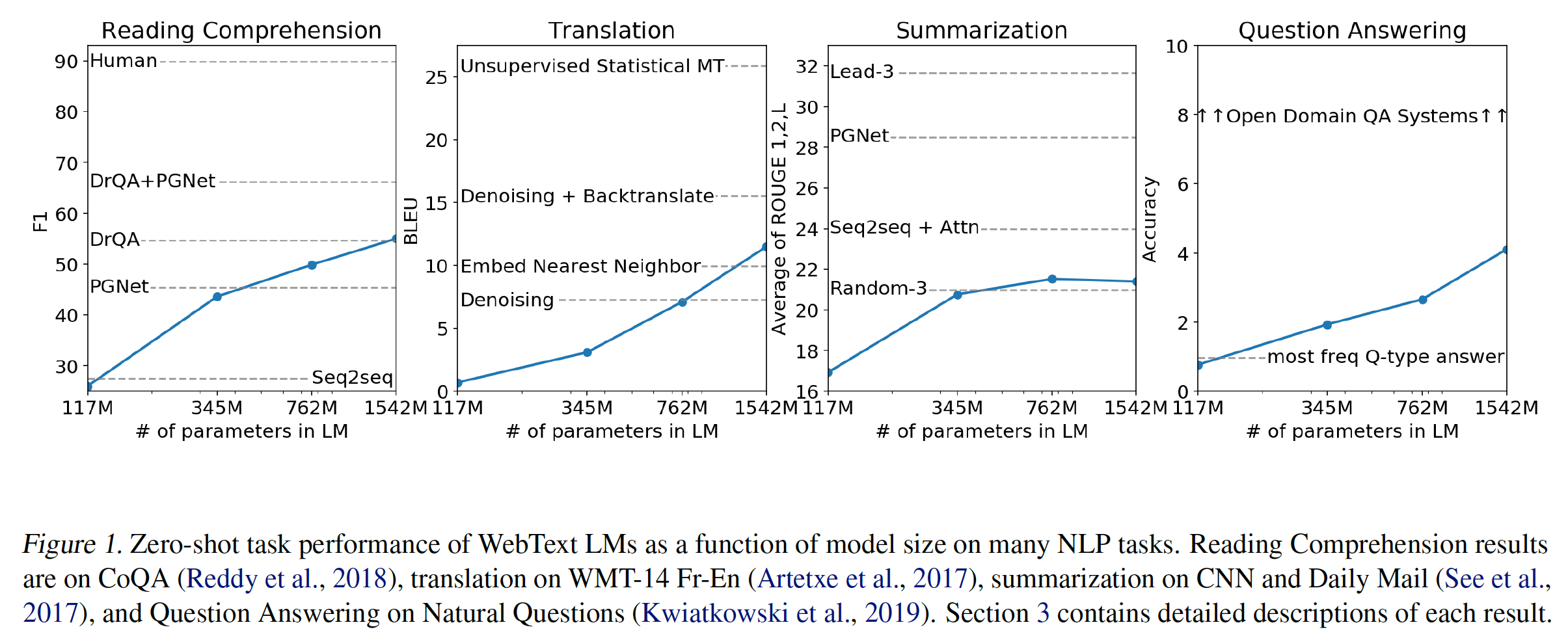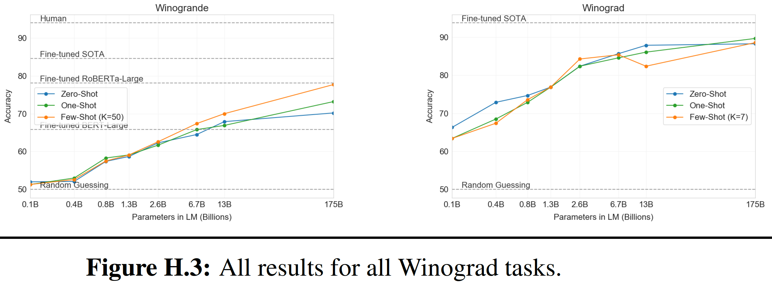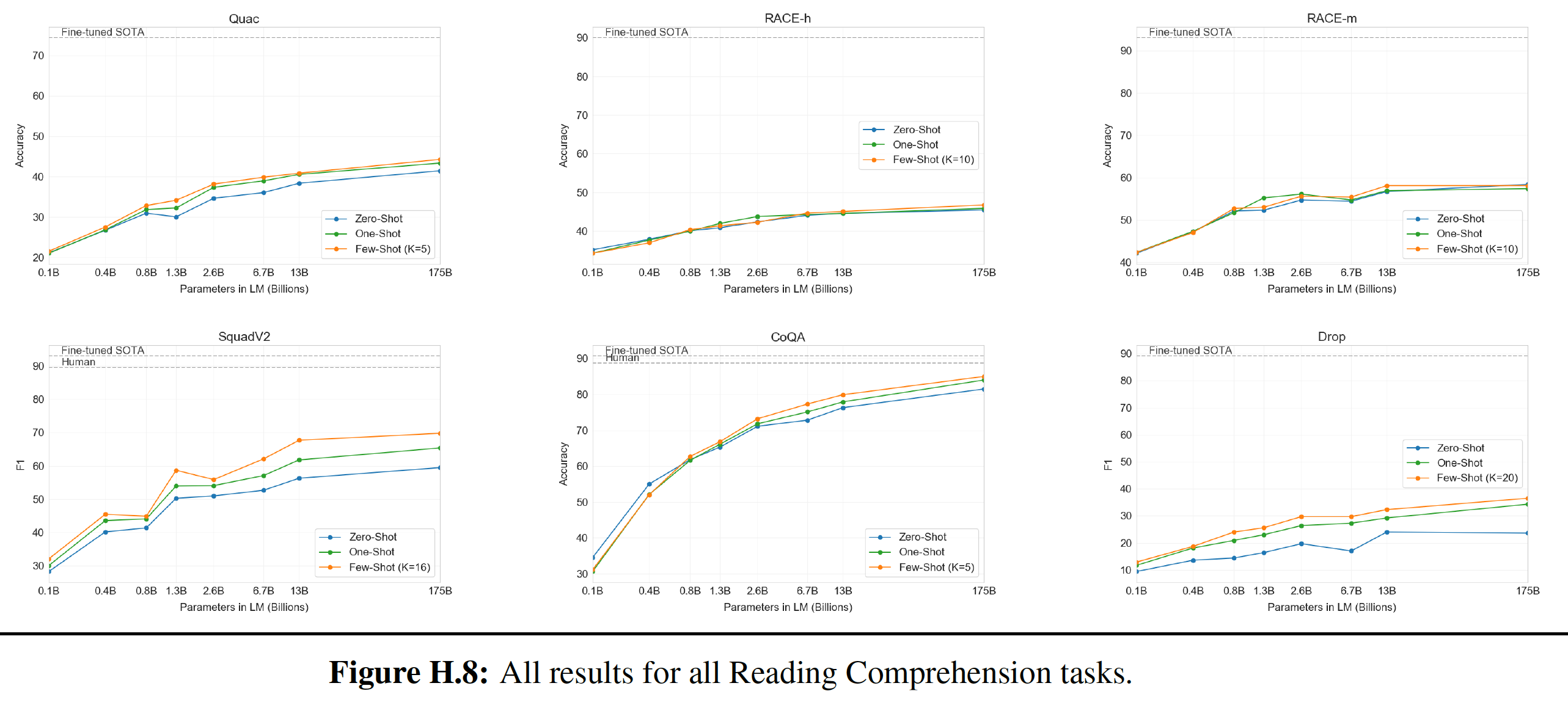 Zero-shot:所有 14 个任务的总体平均 zero-shot 性能如下图所示(忽略了 MultiRC 和 WIC )。总体而言,我们看到我们的平均性能遵循 GPT-3 的趋势。