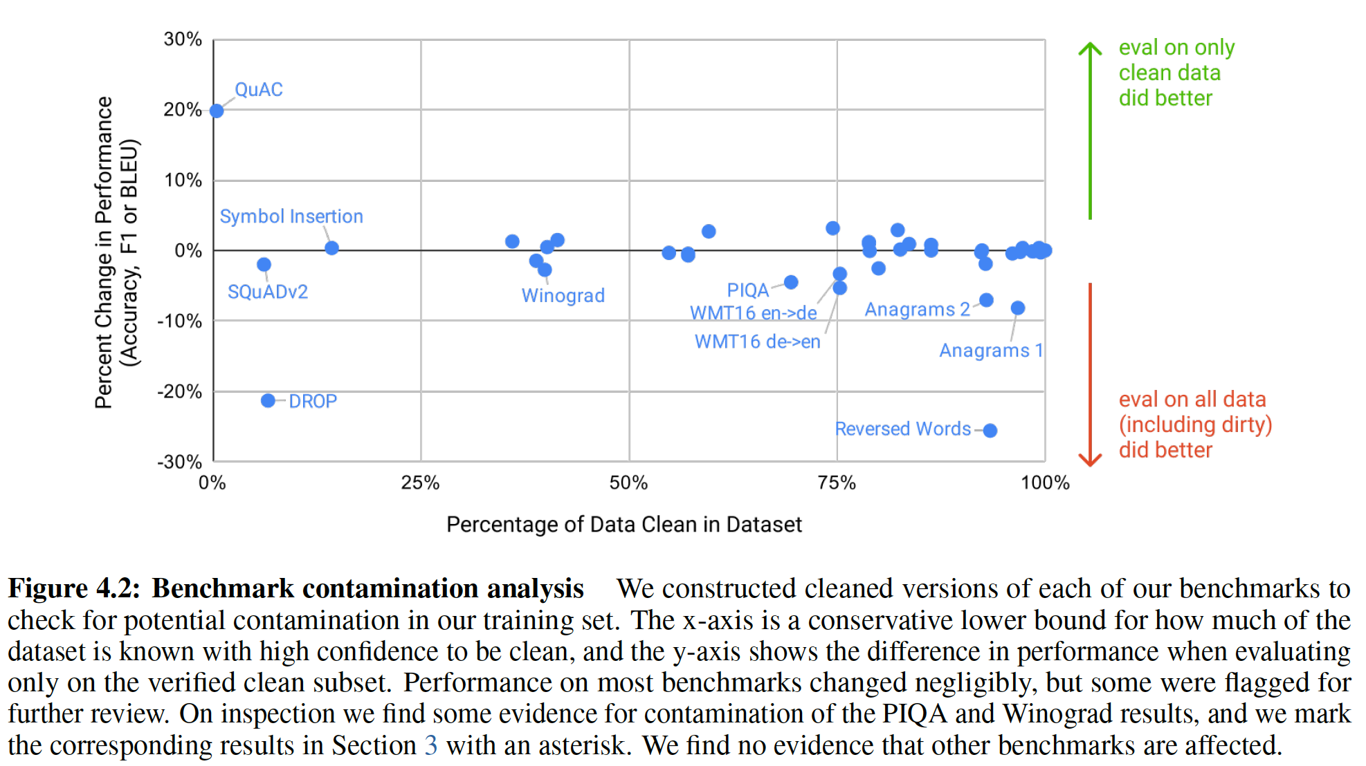 注意,我们有意从这些均值中删除了 MultiRC 和 WIC 任务的结果,因为这两个数据集似乎系统性地倾向于 GPT-3 或者 OPT 。