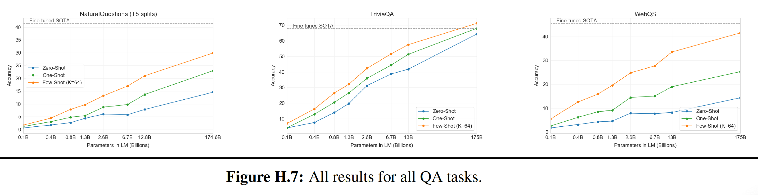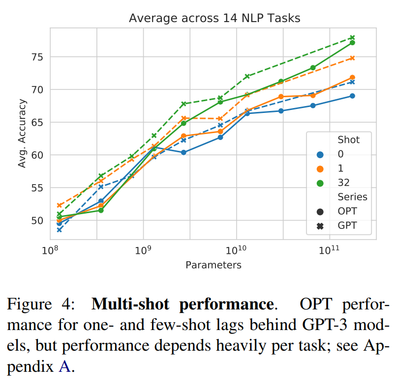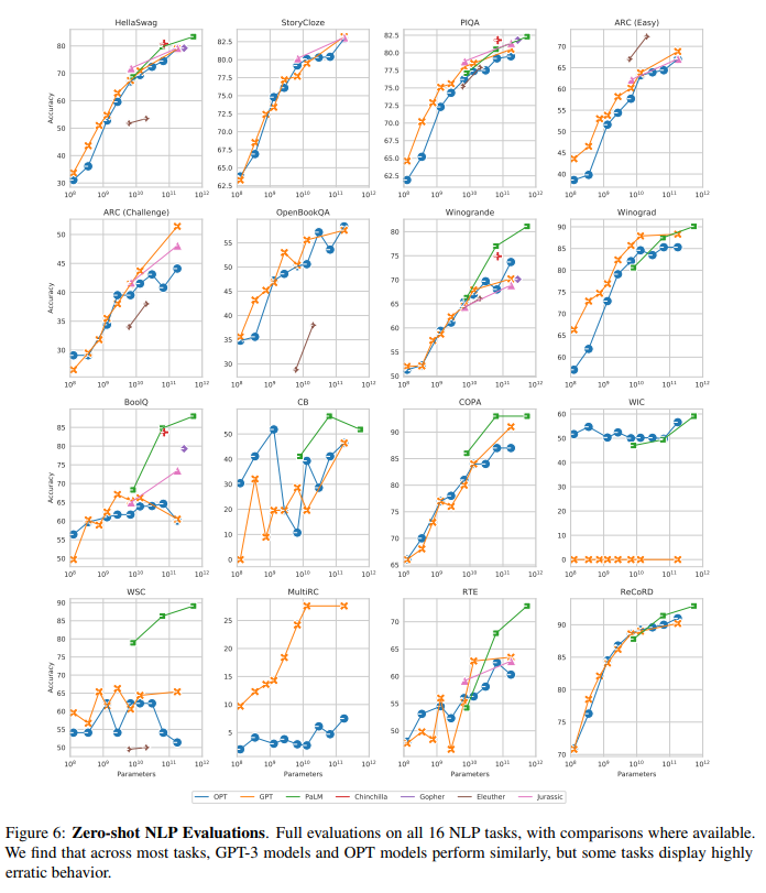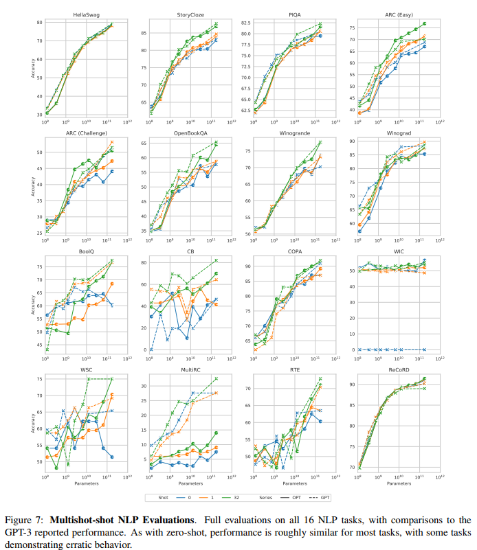 OPT在 10 个任务上的表现大致与 GPT-3 相当,在 3 个任务上(ARC 的两个任务和 MultiRC 任务)表现不佳。3 个任务上(CB, BoolQ, WSC),我们发现 GPT 和 OPT 模型在规模scale 方面都表现出不可预测的行为,这可能是由于这 3 个任务的验证集规模较小(分别为 56 、277、104 个样本)。WIC 中,我们看到 OPT 模型总是优于 GPT-3 模型,尽管 GPT-3 报告的数字似乎也值得怀疑,因为 WIC 是一个二分类任务。MultiRC,我们无法在我们的评估配置中使用 Davinci API 复现 GPT-3 的结果,这表明该任务的评估方法存在差异。BoolQ 和 WSC,我们注意到 OPT 和 GPT 模型似乎都徘徊在 majority-class 准确率附近,这表明概率质量 probability masses 中的小扰动可能在评估中占主导地位。Chinchilla 和 Gopher 在参数规模方面的表现与其它模型大致一致,而 PaLM 通常在所有配置中表现更好,即使在控制参数数量时也是如此。我们推测 PaLM 的良好性能主要来自于更高质量和多样性的预训练数据。One-shot and Few-shot:下图展示了平均的 multi-shot 性能(同样地,忽略了 MultiRC 和 WIC )。