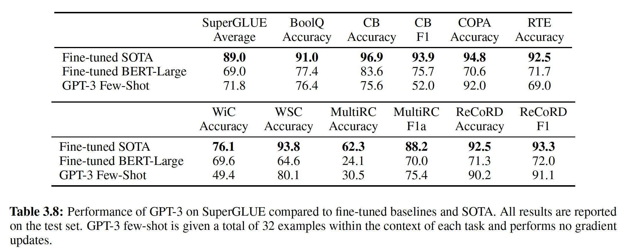 我们报告了准确率指标(考虑到评估指标的一致性,对于 MultiRC 和 ReCoRD 省略了 F1)。对于SuperGLUE benchmark 中的Winograd Schema Challenge: WSC 任务,我们遵循 GPT-3 并将该任务形式化为选择题,众所周知这将影响性能(《Precise task formalization matters in Winograd schema evaluations》)。