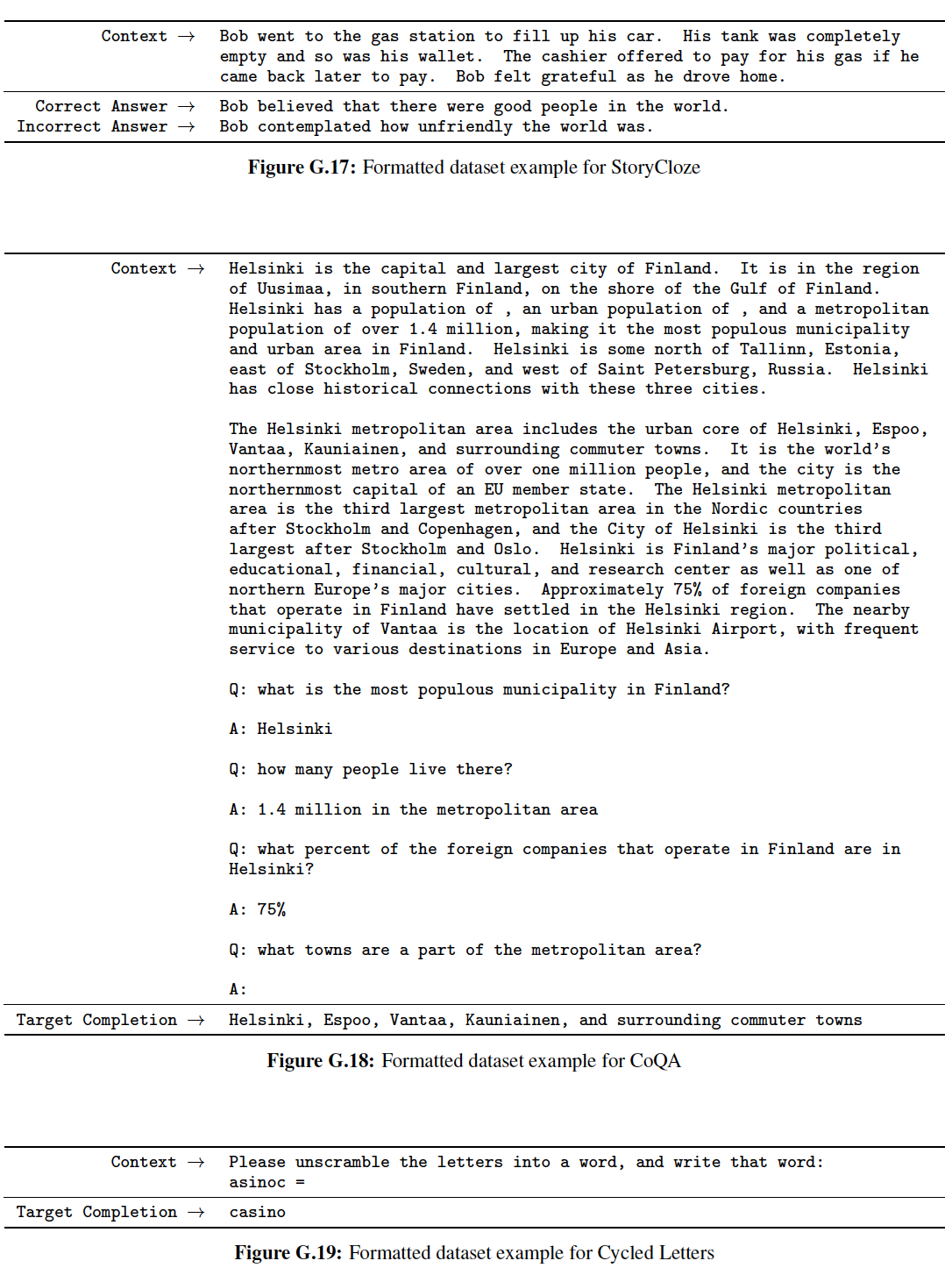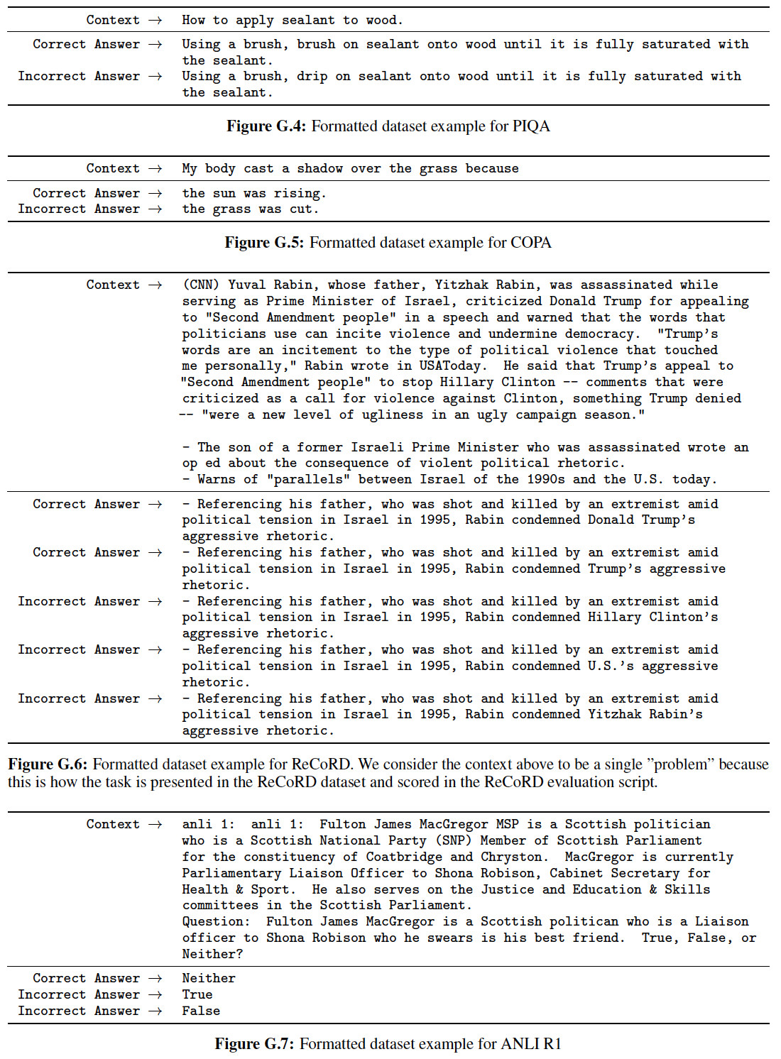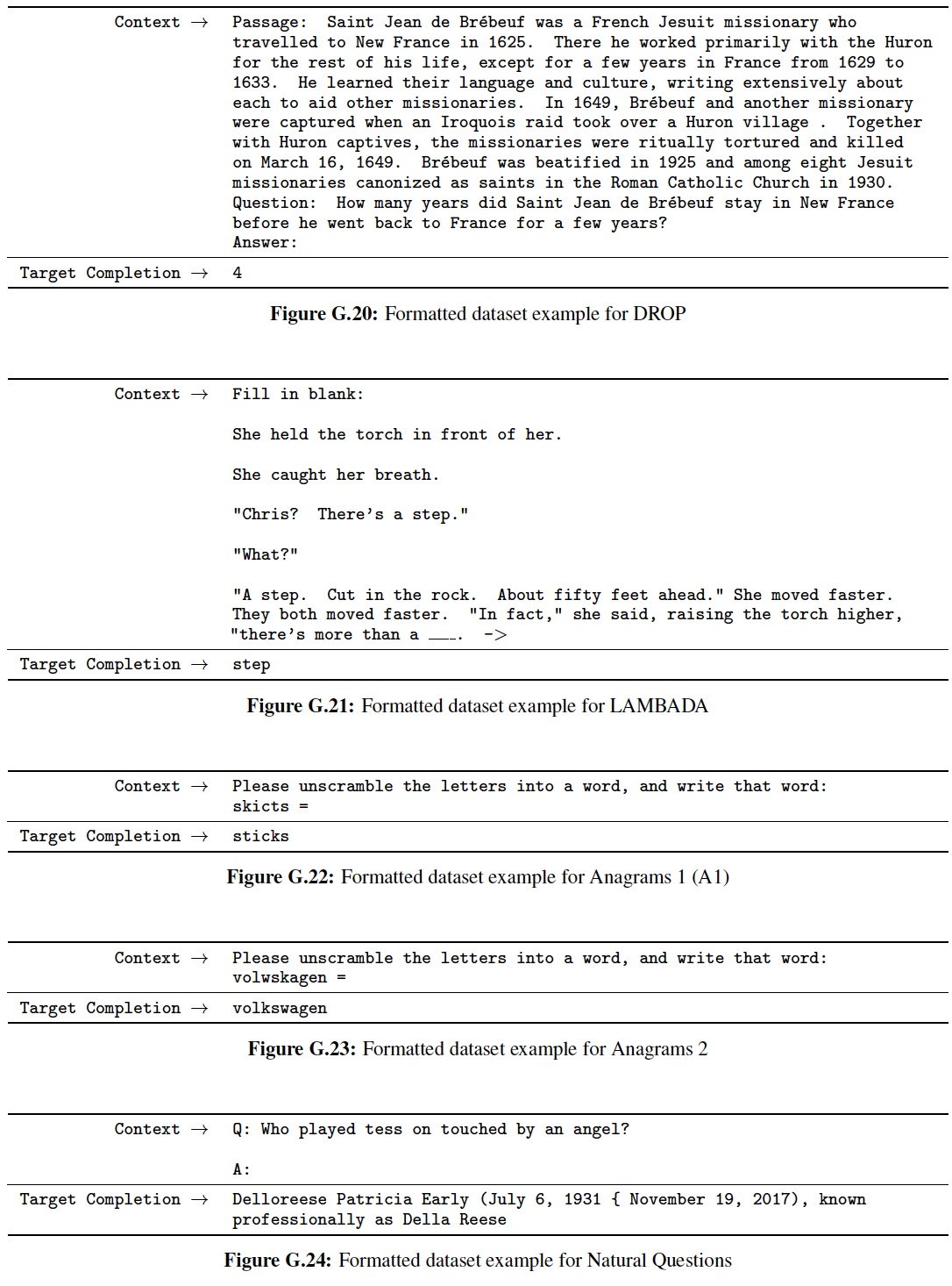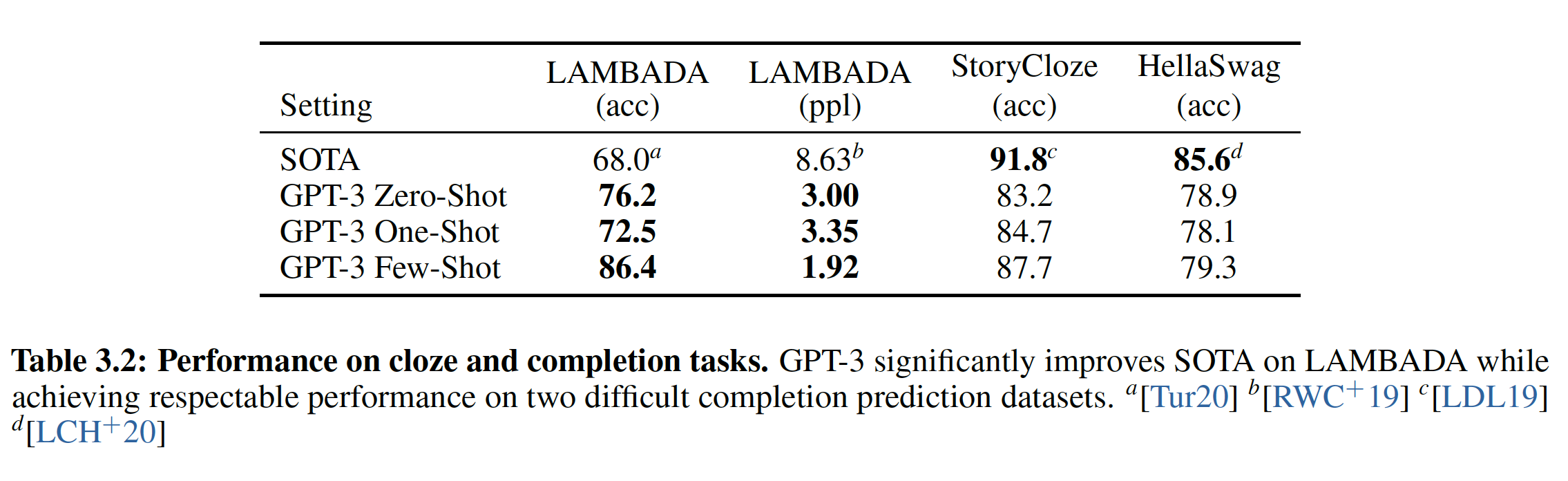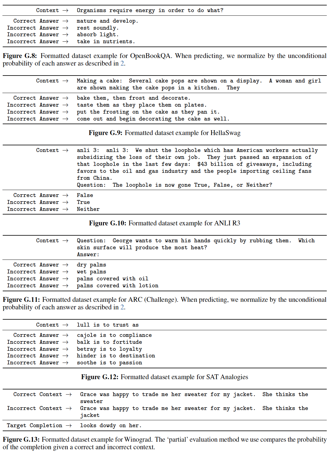 HellaSwag:《Hellaswag: Can a machine really finish your sentence? 》。StoryCloze:《A corpus and evaluation framework for deeper understanding of commonsense stories》。PIQA:《Piqa: Reasoning about physical commonsense in natural language》。ARC Easy and Challenge:《Think you have solved question answering? try arc, the AI2 reasoning challenge》。OpenBookQA:《Can a suit of armor conduct electricity? A new dataset for open book question answering》。WinoGrad:《The Winograd schema challenge》。WinoGrande:《Winogrande: An adversarial winograd schema challenge at scale》。SuperGLUE:《SuperGLUE: A stickier benchmark for general-purpose language understanding systems》。我们遵从 GPT-3 并使用它的 prompt 和整体实验配置。我们主要与 GPT-3 进行比较,旨在重新实现它的评估配置 evaluation setting,但是在可能的情况下在每个任务上报告其它大语言模型的性能(Jurassic-1、Gopher、 Chinchilla、GPT-NeoX-20B)。