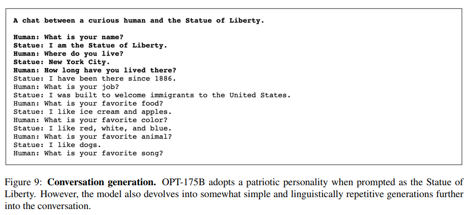 对话生成:当 prompt 为自由女神像时,模型采用了爱国的性格。然而,在进一步的对话中,模型演变成简单和重复的生成。
